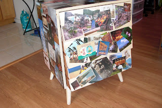 To brighten up the bedroom I covered my dull night stand with some of the vintage images I used for the wall plates, and added a few of our own photos from our time in Hawaii.